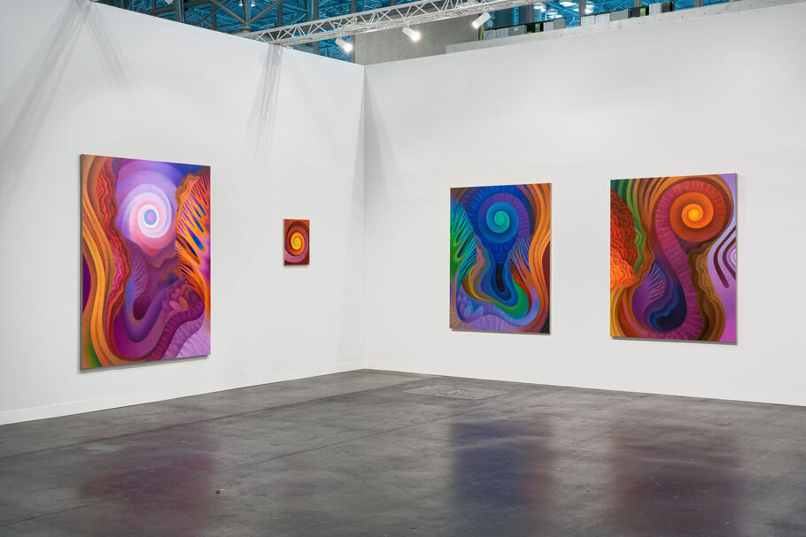 New York–based artist Amanda Baldwin switched her focus from tabletops to ethereal landscapes in 2020. In 2023, she told Artsy that she felt drawn to windows, often featured in the corners of her still lifes. Now, with these new works, Baldwin journeys a bit further, presenting a suite of canvases at London tastemaker Public Gallery’s booth where tree-lined paths unfurl into spiraling skies and kaleidoscopic horizons.