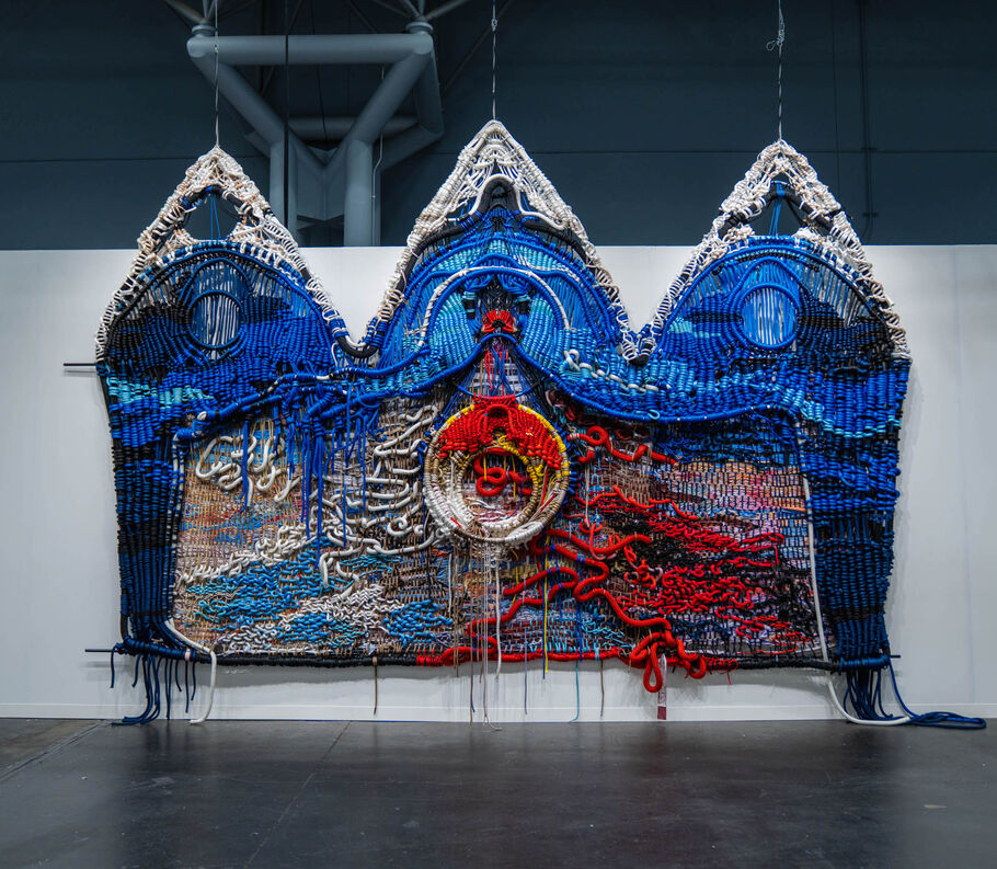 At SECRIST | BEACH’s booth, Chicago-based artist Jacqueline Surdell’s Suddenly she was hell-bent and ravenous (after Giotto) (2025) towers at 14 feet, a colossal reimagining of Giotto’s Last Judgment (1306) remixed from nautical rope and torn-up fabrics printed with the original fresco. Between the fragments of Giotto’s imagery and the dense, sculptural cords, the work invites readings about labor and the persistence of power systems across centuries.