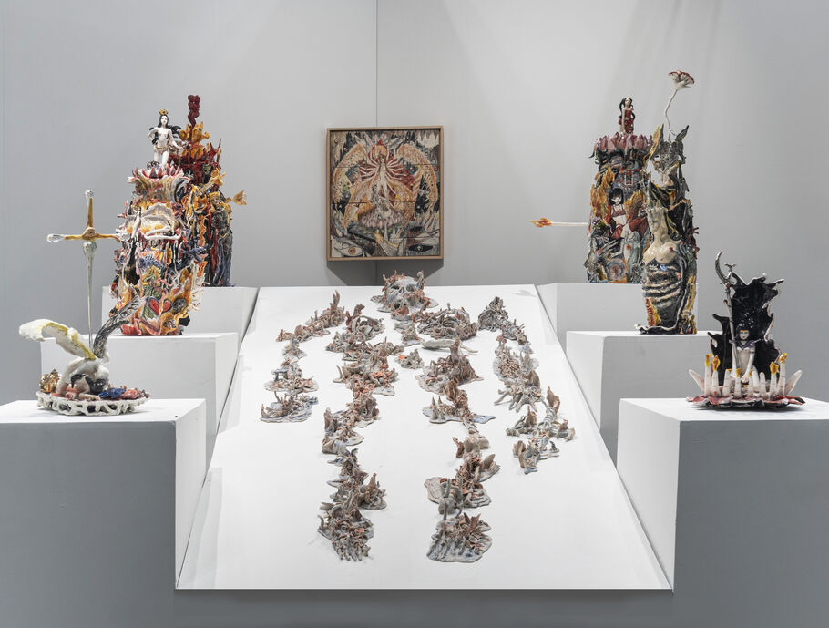 New York–based Swivel Gallery staged its booth to resemble a shrine. Alejandro García Contreras’s “Quién no ha intentado convertir una piedra en un recuerdo?” (2024), a skeletal figure comprising several separate glazed ceramic pieces, lies in repose. Surrounding this devilish sculpture, Contreras places six elaborately adorned ceramic vessels, incandescent objects decorated with images of heaven and hell, sex and sanctity, anime and folklore. “We devised the booth to be this modern ruin in a way, so it enshrines this skeletal figure,” said the gallery’s founder Graham Wilson, noting that it was inspired by a book of occultism that the artist received from his grandfather.