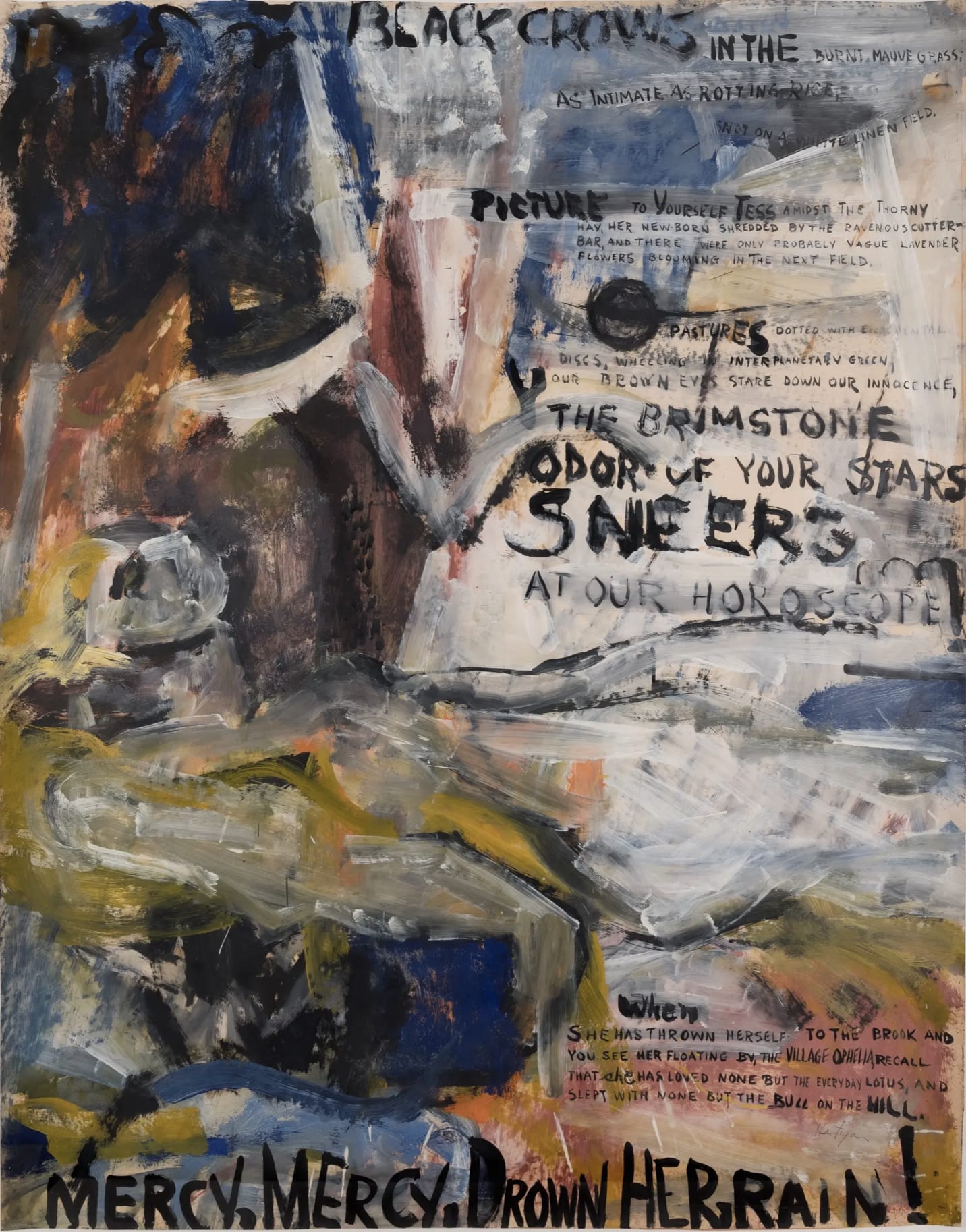 Along with forty-five works by Hartigan, this exhibition includes the poems that inspired her and archival matter—such as copies of Folder journal, which Hartigan made screen prints for—from 1952 to 1968. During this exciting period, Hartigan worked in diverse media and collaborated intensely with a community of artists and poets who coupled in equally diverse arrangements—lesbian, gay, gay and straight (and Hartigan, while straight, described her relationship with the gay O’Hara as a love affair). Curator Jared Ledesma describes Hartigan’s community as queer and, indeed, these artists were experimenting with fluidity in both sex and art long before the concepts gained cultural currency. In this light, Hartigan’s paintings can be reappraised. Of her painting Black Crows (Oranges No. 1) (1952), for example, which includes phrases from O’Hara’s poem (“the brimstone odor of your stars sneers at our horoscope”), the viewer sees the painting stage the mutability the artists lived as the words melt into the canvas.