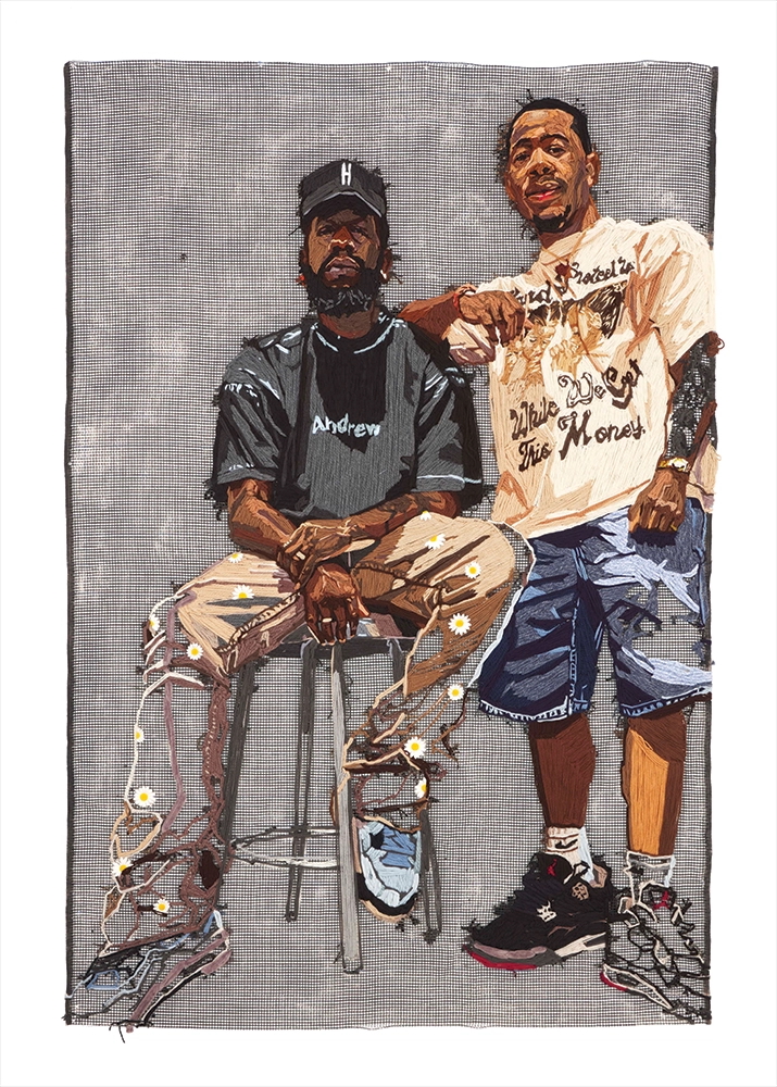 But nearly as important as the woven parts of her pieces are the spaces she leaves empty in her works, like LoriAnn’s hair. “They’re still growing, so the negative space still reads as an incomplete person,” she says. “When it comes to hair, I want the emphasis to be on what’s not there, because it starts these conversations. Hair is such an important part in Caribbean culture, Black culture and this idea of good versus bad. It’s important for me to get people to start thinking about why.”